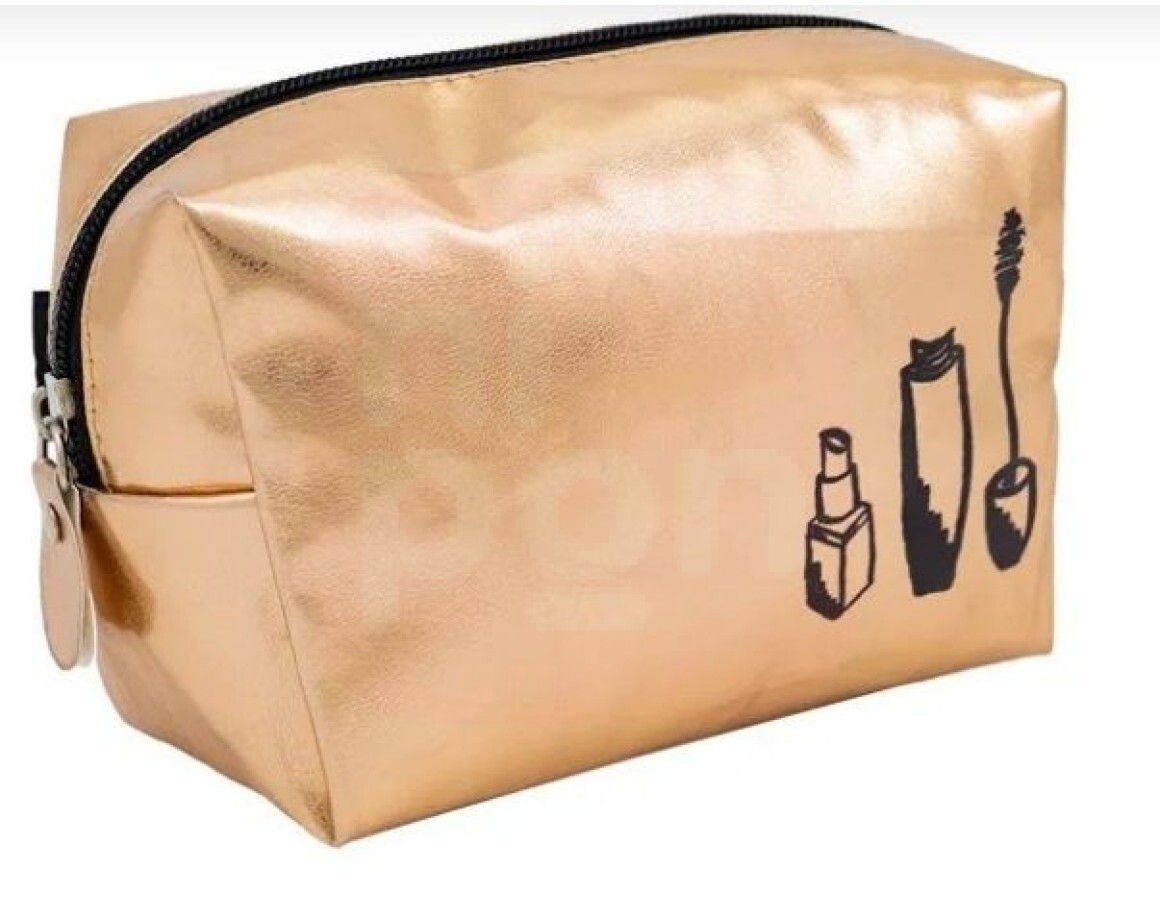 A nécessaire possui espaço suficiente para acomodar diversos itens essenciais de maquiagem, mantendo-os organizados e acessíveis quando necessário. Sua estampa dourada com os desenhos de um pincel de máscara de cílios e um batom a torna um item de moda que pode ser exibido orgulhosamente em sua bolsa ou mesa de maquiagem.