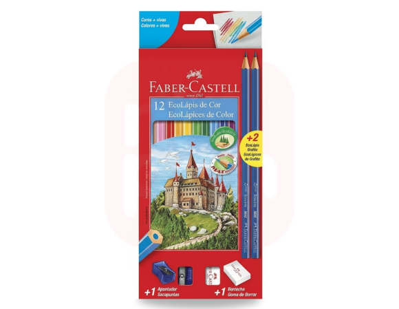 Lápis de Cor 12 Cores, Kit com Apontador, Borracha e 2 Grafite - Faber-Castell
