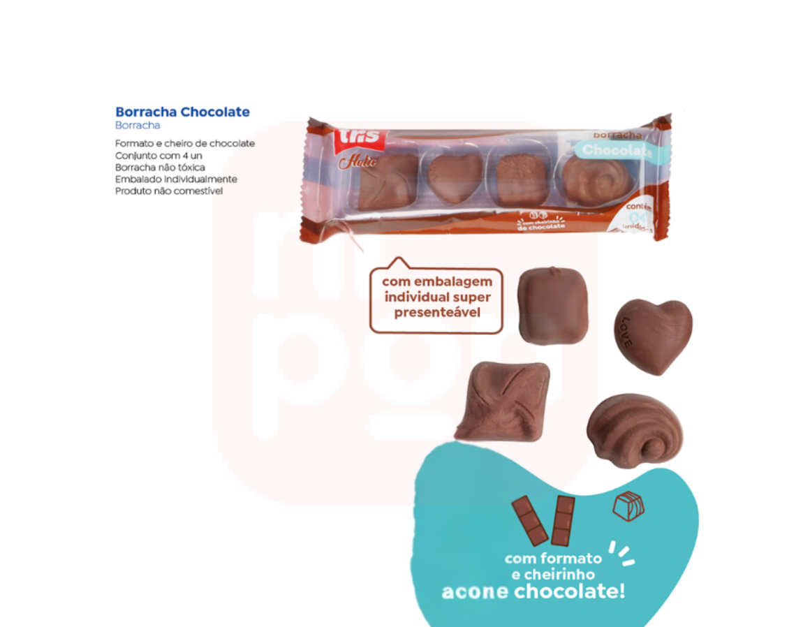 A Borracha Chocolate TRIS é a escolha perfeita para quem adora papelaria divertida com toque criativo. O kit vem com 4 borrachas em formato de tabletes de chocolate, trazendo charme e estilo para o seu estojo. Além do visual irresistível, oferece excelente desempenho ao apagar, removendo o grafite com suavidade e sem danificar o papel.